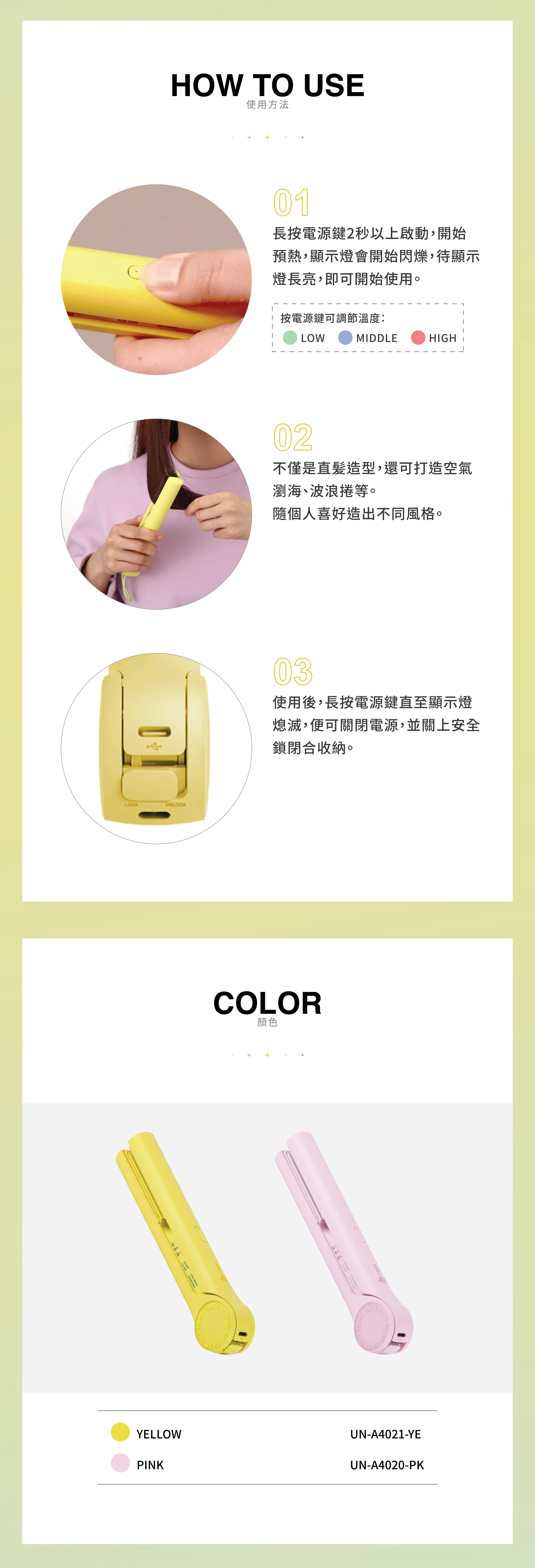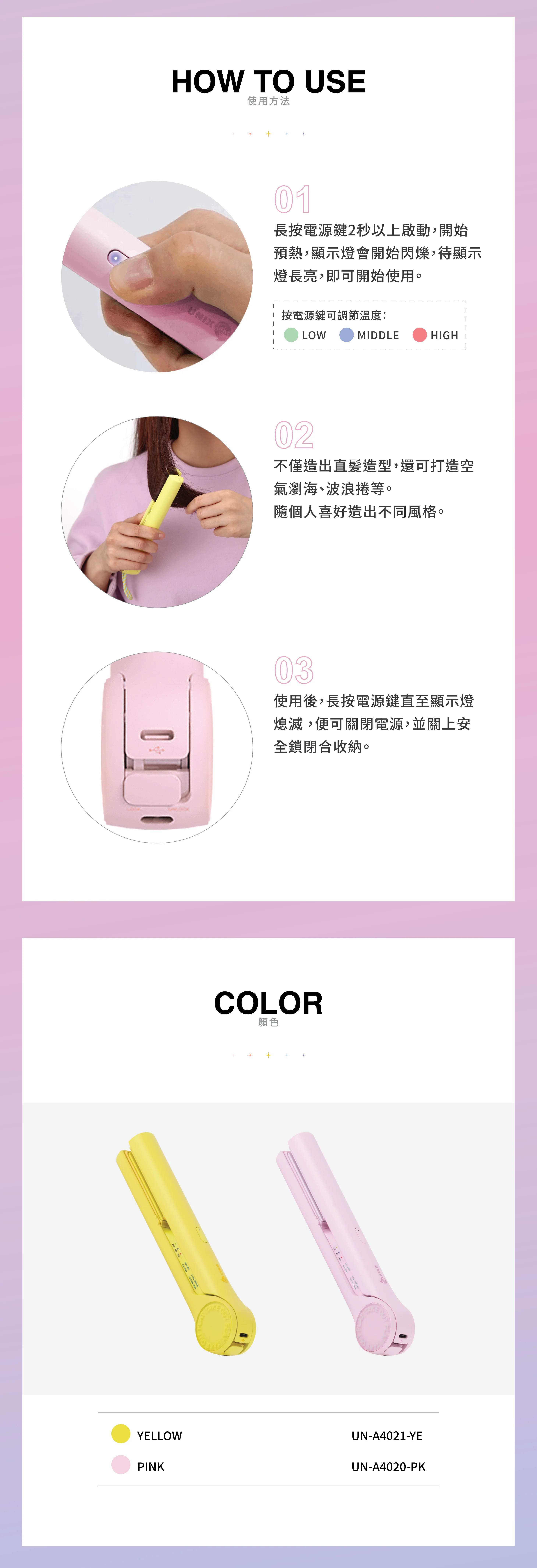UNIX 無線直髮夾 UN-A4020-PK/UN-A4021-YE 是一款輕巧便攜的無線直髮夾,專為快速造型和外出補妝而設計。它採用 Type-C 充電,方便實用,讓您隨時隨地保持完美髮型。